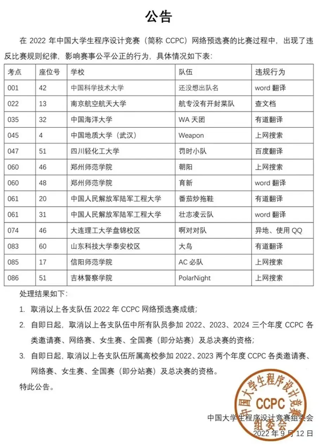 換句話說,這13所學校的所有學生,今年和明年都不能參加中國大學生程序設計競賽。