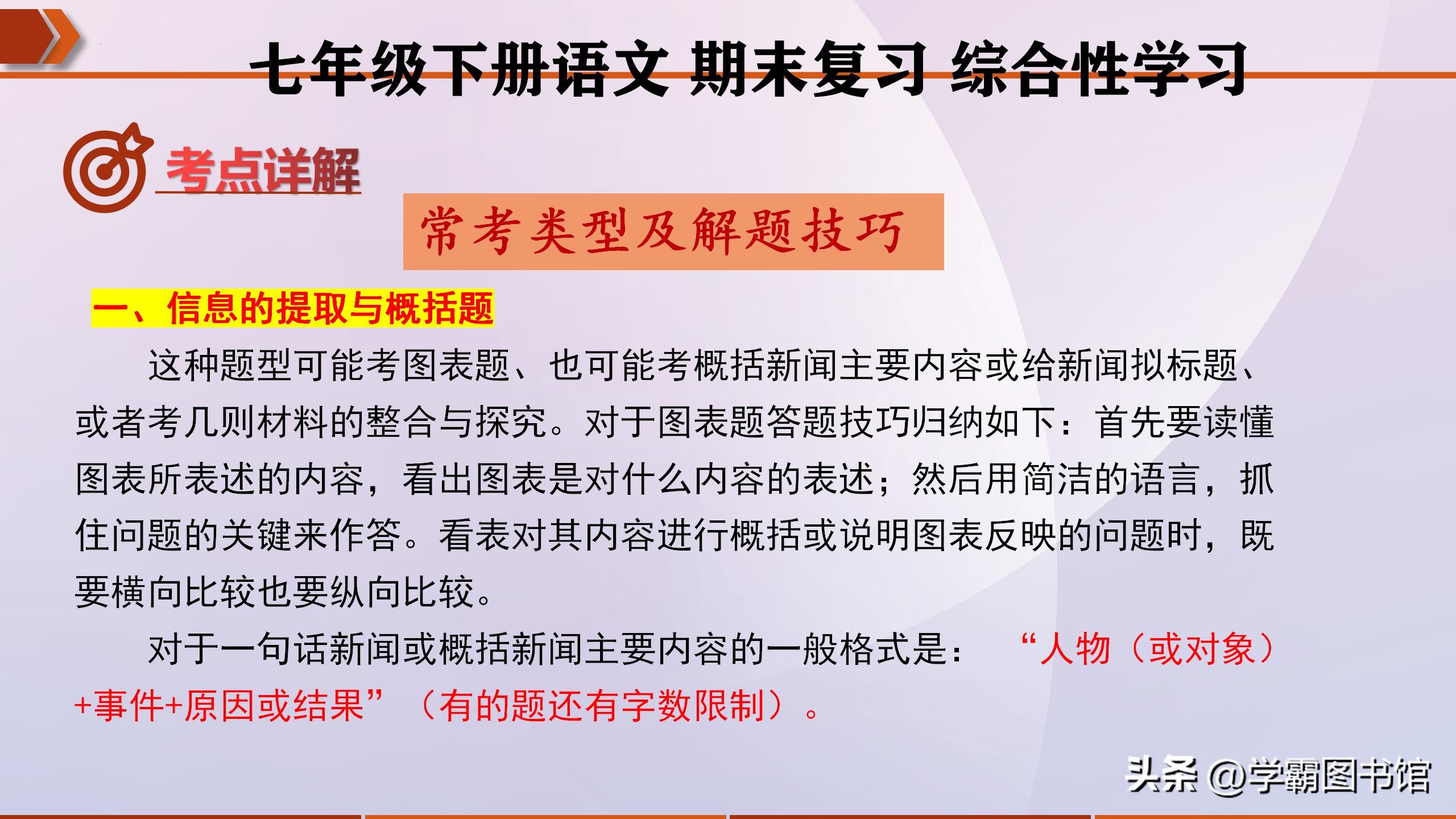導讀七年級下冊語文,綜合性學習類題型是期末必考題型,這類題型的主要特點是聯系學生實際,真實性強,且地方特點明顯,鄉土氣息濃郁,內容涉及學習交流、推廣普通話、采訪、寫公益廣告、設計欄目、提建議等,與語言的實
