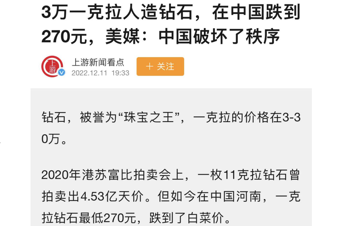現在中國技術崛起后,高質量人工鉆石實現輕松產出,產能也大大提升,自此成功打破了老外壟斷。結果本是造福消費者的好事,卻硬生生被他們解讀成破壞秩序,讓人感到好氣又好笑。