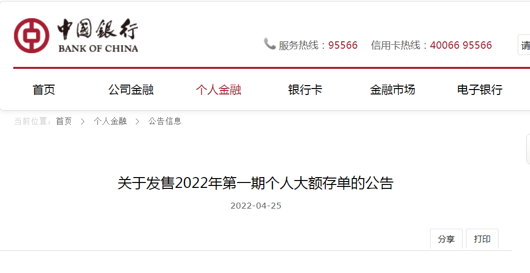 4月25日,中國銀行在其官網發布了關于發售2022年第一期個人大額存單的公告。