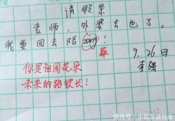 這張假條的內容是:“老師,外婆去世了,我要回去陪zàng。”看來這位小朋友請假的原因是,親人去世,要回去“送葬”。但是由于措辭不當,他居然說成了“陪葬”。老師看后評語:“你是祖國的花朵,未來的路還很長。”這評語著實讓人覺得好笑。
