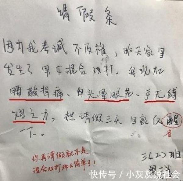 這位同學有點慘,因為考試不及格被爸媽混合雙打,打得他腰酸背痛,頭昏眼花,手無縛雞之力,看起來十分可憐,很讓人同情,他想請3天假在家里反省一下。老師看到這張請假條笑得眼淚都出來了,馬上告訴這位同學,要是再請假的話就不是混合雙打這么簡單了。