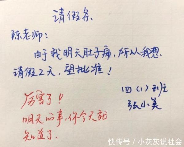 這位小學生寫的假條,乍一看格式是正確的,字跡也比較整齊美觀。但是仔細一看讓人哭笑不得,原來這位小學生請假的原因竟然是生病——明天要肚子痛,這位小學生,難道寫之前不知道看看理由是否有問題呢?老師的評價是:厲害了,明天的事今天就知道了。