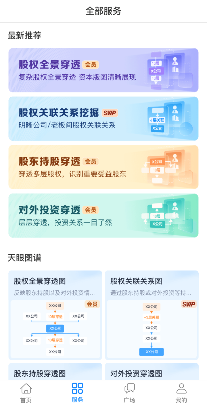 據悉,“天眼圖譜”重磅升級上線的4大新功能已在網頁、移動端全面上線開放。網頁端用戶搜索目標公司/老板后,在詳情頁可查看相關新功能,或者直接點擊下載“股權全景穿透報告”使用。移動端用戶通過底部導航欄的“服務區”體驗更為方便快捷。