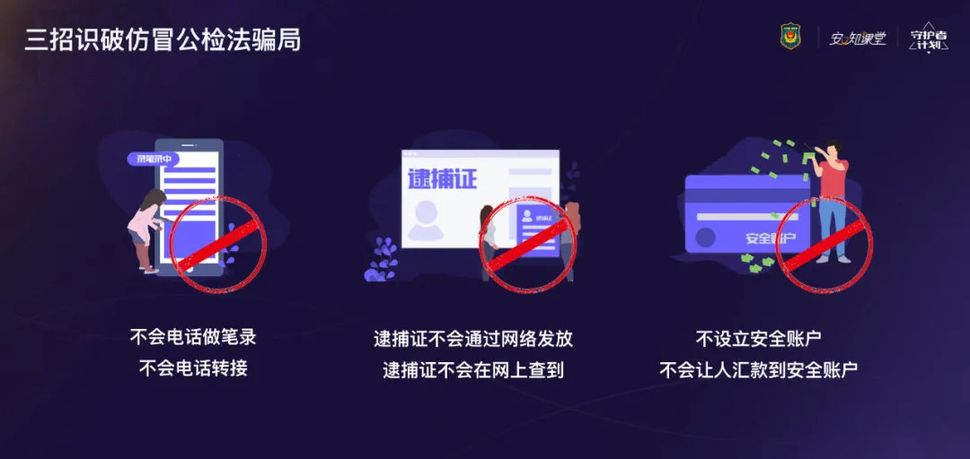 1、凡是通過電話、QQ、微信或者其他通訊交友軟件辦案做筆錄的“公檢法機關”,一律是詐騙;2、凡是通過網站或者APP出示帶有“公檢法”的名稱標記的通緝令、拘捕令、警官證,一律是詐騙!3、凡是要求內容絕對保密,或要求前往酒店等隱蔽的環境接受調查或自證清白,一律是詐騙!4、凡是主動“幫你”轉接電話至公檢法,或要求設置呼叫轉移,一律是詐騙!5、如果發現手機里有大量未接來電或者短信,一定要及時回復。真警察會用盡一切辦法聯系你阻止轉賬!?