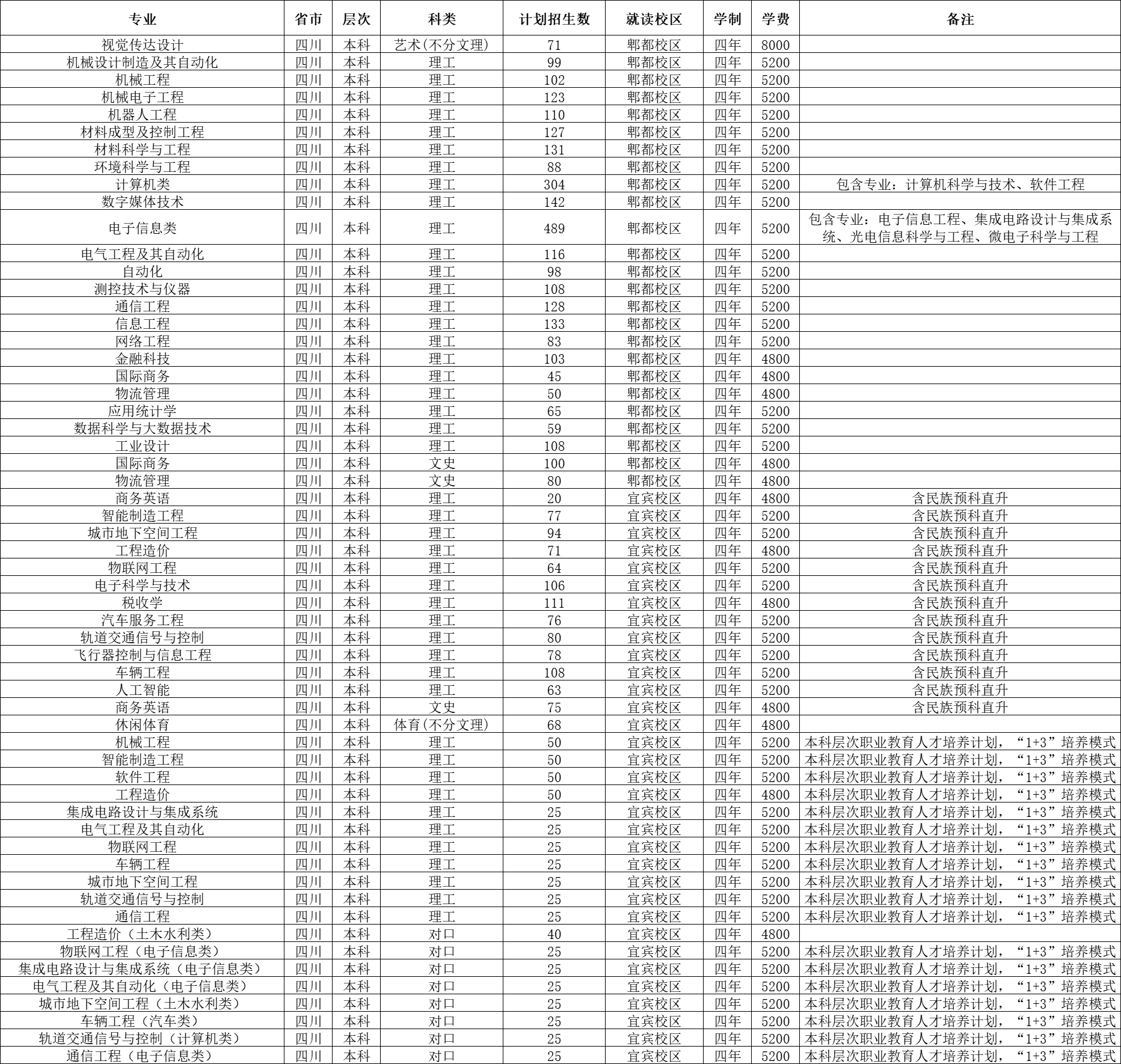 理工類招生人數較多的專業(郫都校區):電子信息類489人、計算機類304人、數字媒體技術142人 、信息工程133人、材料科學與工程131人、通信工程128人、材料成型及其控制工程127人、機械電子工程123人、電氣工程及其自動化116人、機器人工程110人、測控技術與儀器108人、工業設計108人、金融科技103人、機械工程102人。