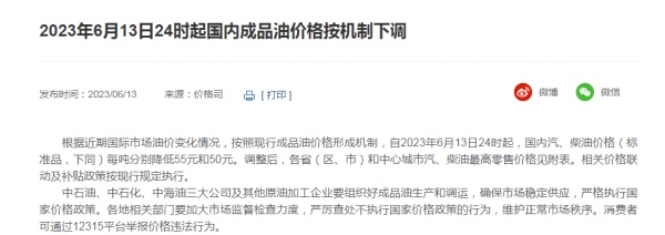 6月13日,國家發改委消息顯示,根據近期國際市場油價變化情況,按照現行成品油價格形成機制,自2023年6月13日24時起,國內汽、柴油價格每噸分別降低55元和50元。