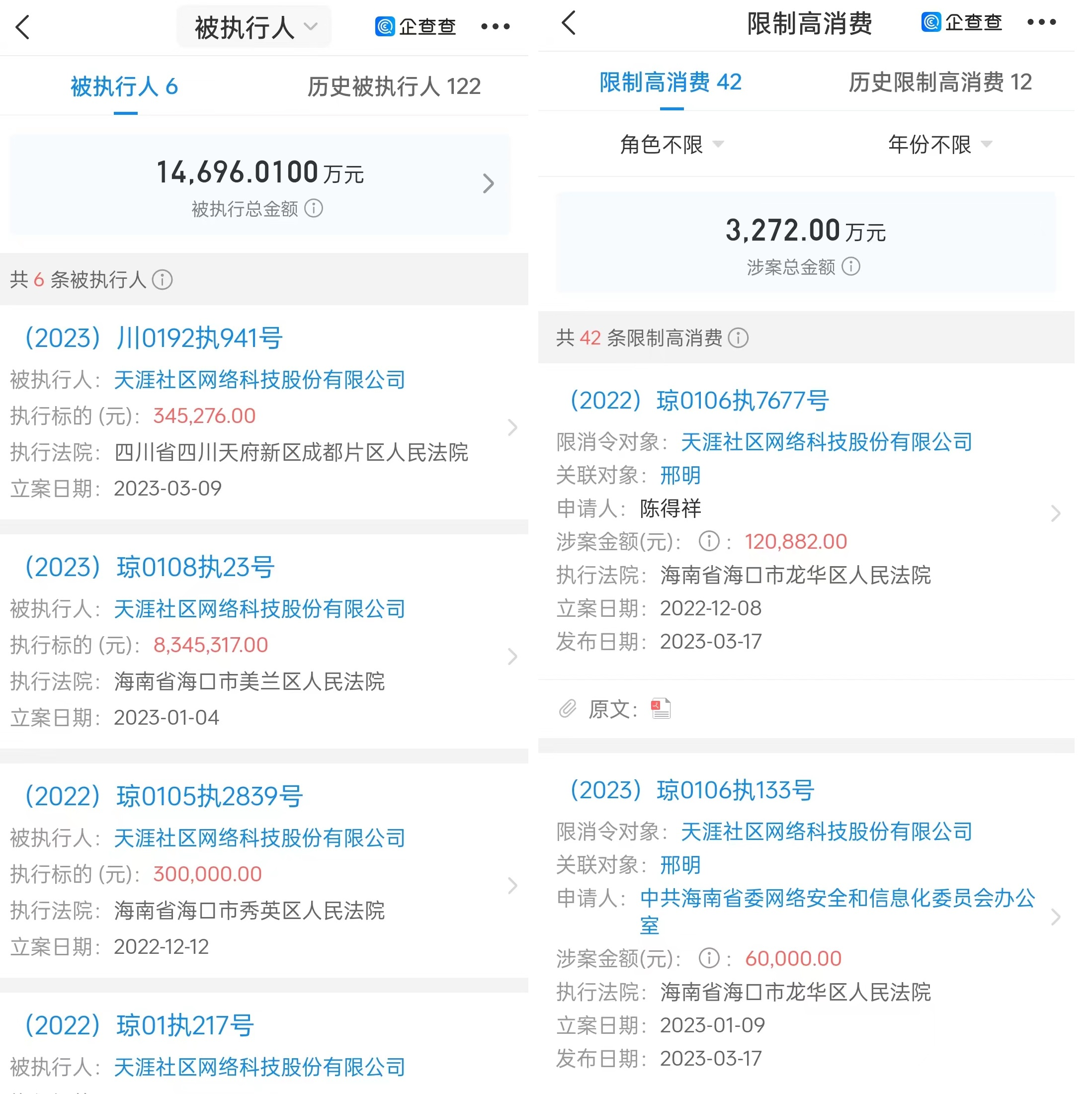不過,近年來,天涯社區日趨陷入困境。企查查APP信息顯示,目前該公司存在6條被執行人信息,累計執行標的超1.46億元。天涯社區創始人邢明、法定代表人為邢明亦有多條限制消費令。