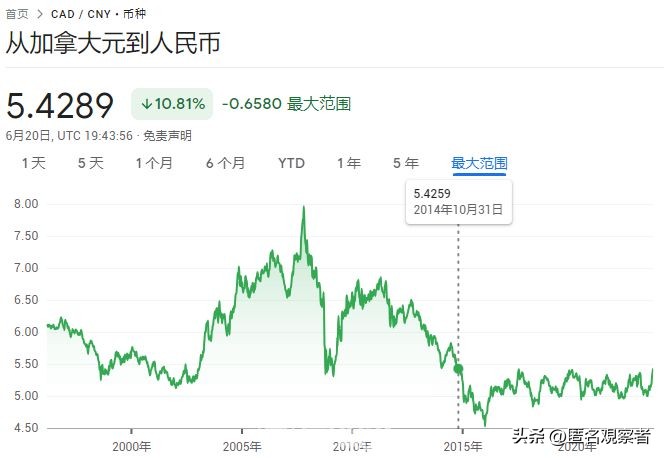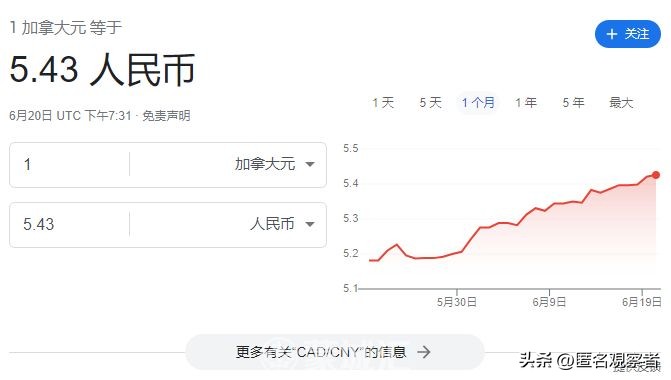 加元這兩天漲瘋了啊!根據谷歌財經的消息顯示,目前加幣兌人民幣升至:$1加元=¥5.43人民幣。圖源:谷歌財經