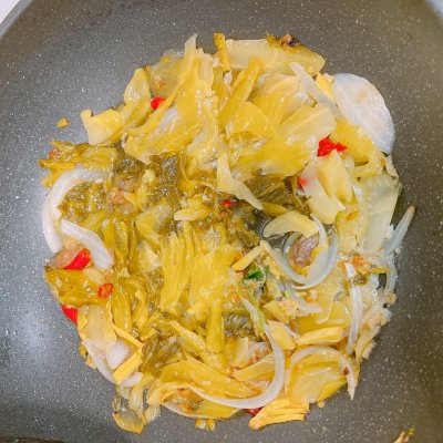 2、熱油放蒜、姜、指天椒、洋蔥,炒香后放酸菜,炒30秒加一碗水 燜到水稍微收一些
