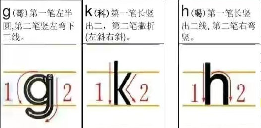 g:先寫左半圓,占滿中格,再寫豎左彎,過第三線,兩筆寫成。