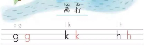 k:先寫一豎過第二線,在中格寫左斜、右斜,兩筆寫成。