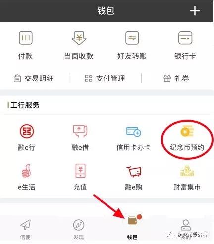 提前下載好“工銀融e聯”手機客戶端,先點擊最下方菜單的“錢包”,會有“紀念幣預約”圖標。