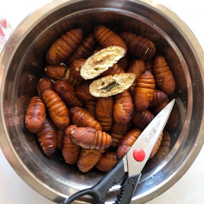3、煮好的蠶蛹晾涼后,用剪刀從中間剪開,取出中間黑色硬芯
