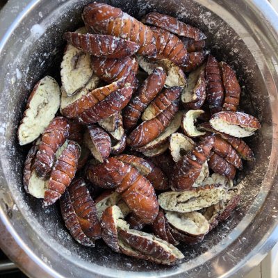 4、將處理好的蠶蛹輕輕握一下,我出多余的水分后,將入適量淀粉或炸雞粉翻拌均勻,加入少量鹽和胡椒粉給一個底口