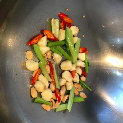 9、蠶蛹在空氣炸鍋里面的時候我們可以準備一下配菜,芹菜切段,小米辣或干辣椒切段,再準備一些大蒜瓣和花生米,花生米用來使口感更加豐富,沒有可以不放