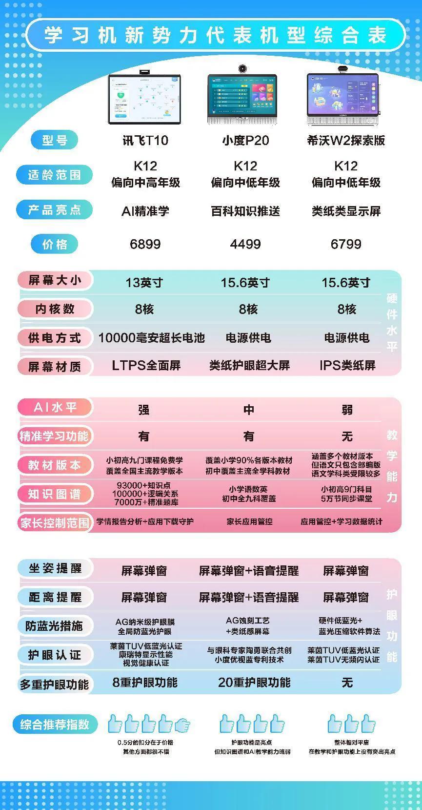 總體來看,這三款學習機各有側重點,訊飛T10側重教程,課程豐富,智能化高,能夠引導學生學習,孩子學習起來家長更省心也放心,小度P20護眼功能強大,護眼功能細節上做的誠意滿滿,但最大的問題是高中教程薄弱,這個略有遺憾,希沃W2教程雖然也有高中教材,但產品內容上偏向于學齡前兒童,它之前一直主打大屏護眼等,將護眼作為最大的賣點,但經過實測,我們發現希沃W2護眼功能細節上,處理上不足,護眼效果存疑。