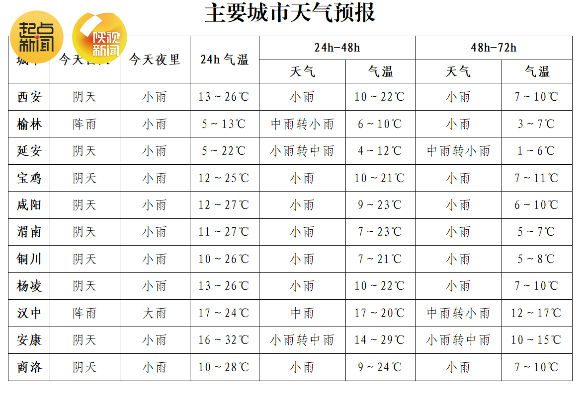 21日:陜北、關中大部中雨,關中南部局地大雨,陜南大部有中到大雨,陜南南部局地有大到暴雨。日平均氣溫陜北北部下降6~8℃,陜北南部、關中、陜南東部下降 10~12℃、部分地區下降12~14℃,陜南西部下降4~6℃。陜北有5~6級偏北風,陣風可達7~8級以上,關中北部、陜南部分地方有4~5級偏東風。