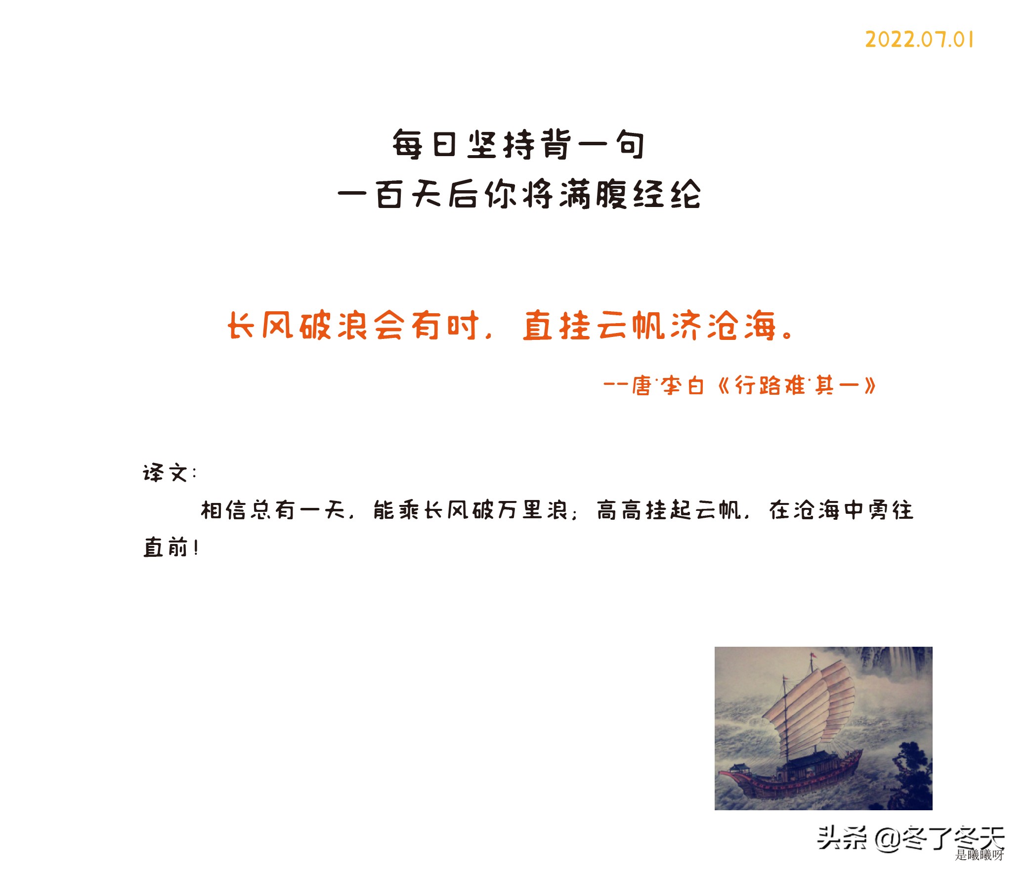 導讀每日堅持一句長風破浪會有時,直掛云帆濟滄海。《行路難》是李白最著名的詩詞之一,當時李白在政治道路上遭遇挫折,既不愿同流合污又不愿獨善一身的矛盾。“長風破浪”也指詩人的政治理想,雖然現在遭遇挫折,但皇天