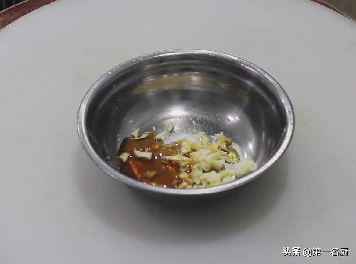 下面我們開始調一些料汁,這樣吃起來口感會更好:準備大蒜2粒,依次拍扁,切成蒜末,放入小盆中。