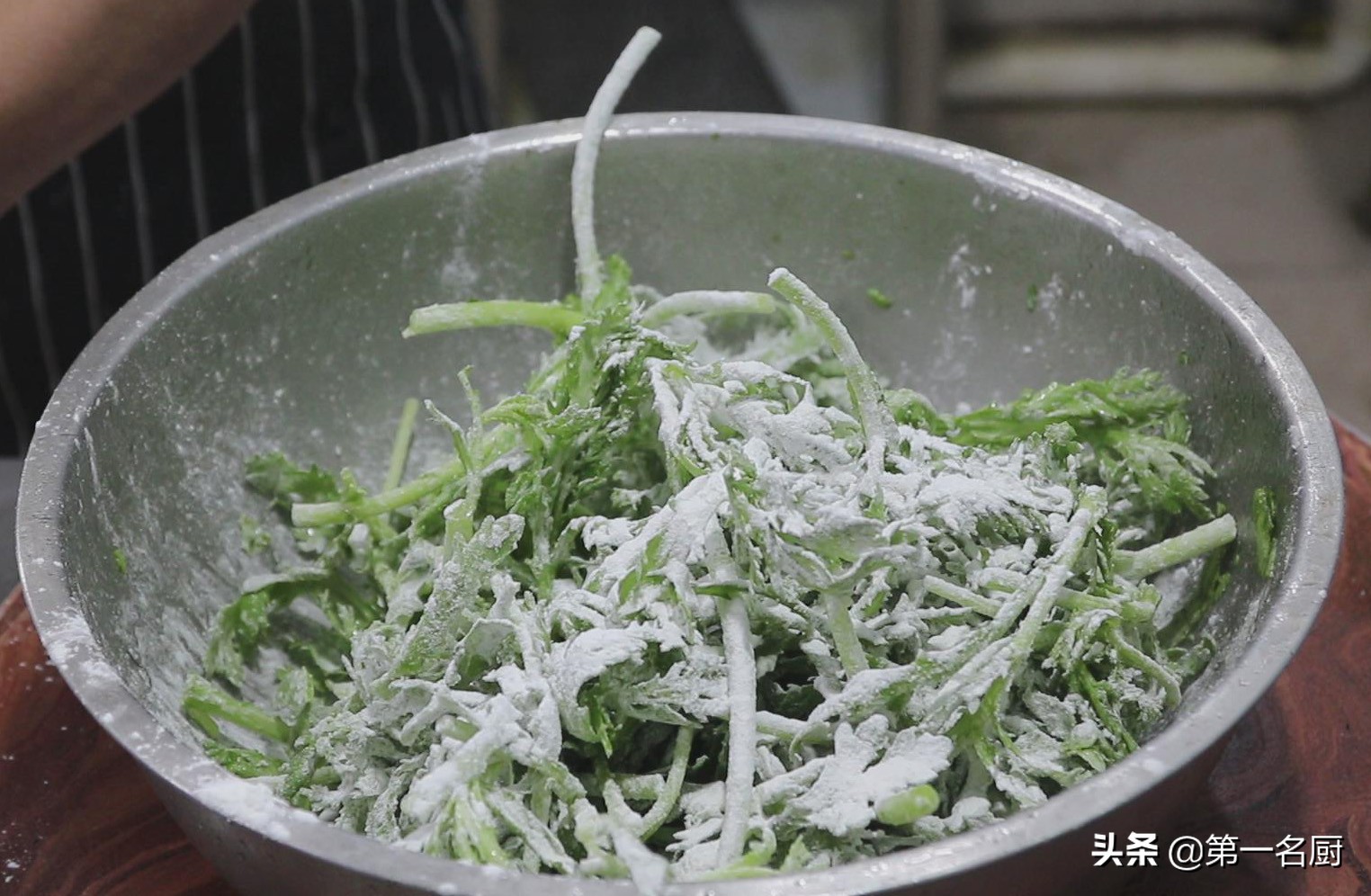 再撒上適量面粉或干淀粉,用手抖散拌勻,以茼蒿不粘手為宜,蒸茼蒿時面粉不易放的太少,否則會坨在一起,影響口感。