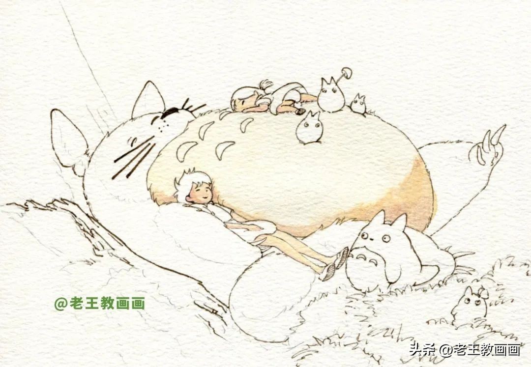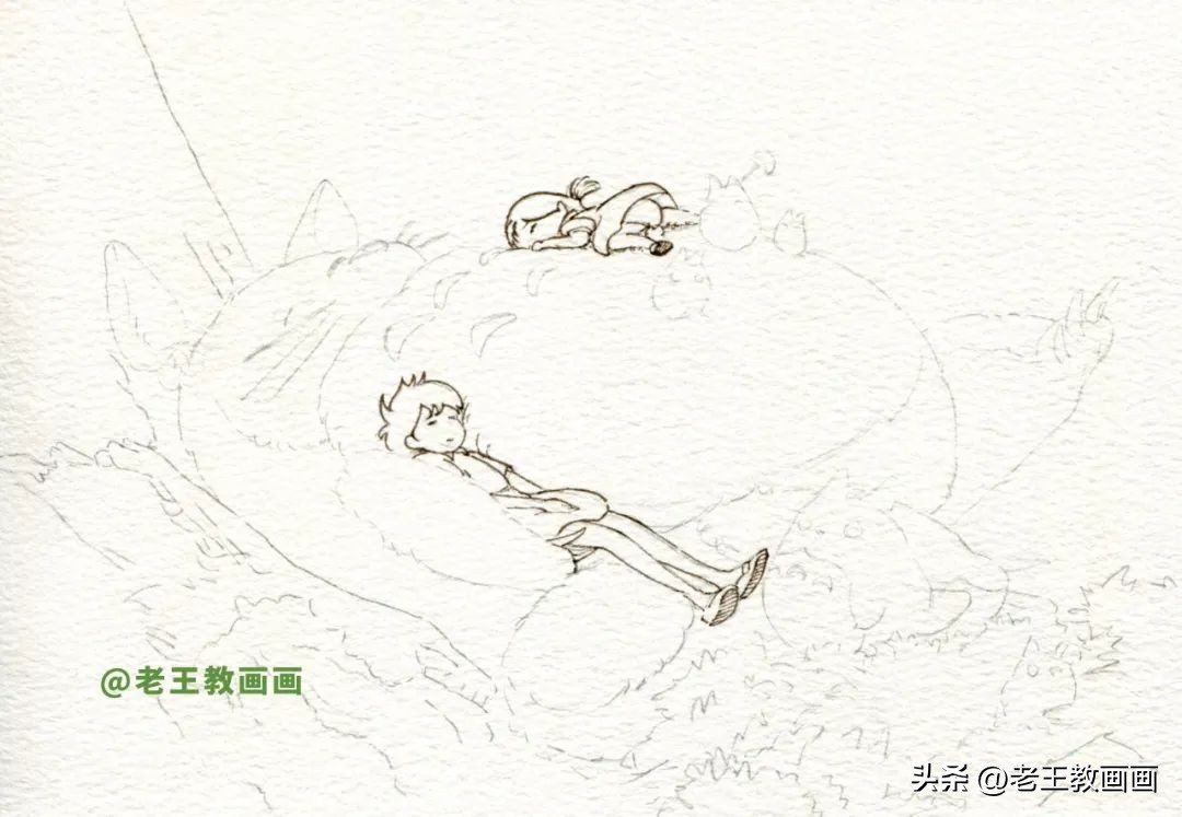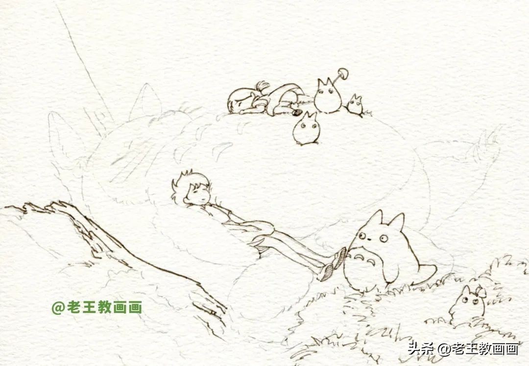 》》》【第1步】:這是一幅大龍貓,小龍貓和兩姐妹的溫馨畫面。根據下圖,畫出龍貓和人物的形體,這一步比較難,大家要認真仔細的畫形體(P1↓)