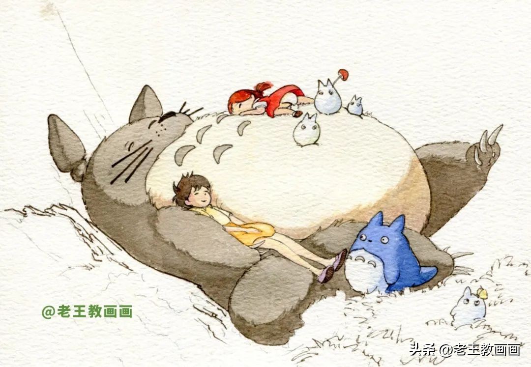 》》》【第9步】:刻畫背景,用114號綠色水彩,加少許水,畫背景的淺綠色;然后再用115號綠色水彩,畫右上角的重綠色;重點刻畫前面的草地,草地是蓬松的質感,用水彩筆尖來點綴草的生動;用114號綠色畫草地的底色,再用115號綠色水彩,畫兩邊草地的顏色,最后,用092號深綠色畫草地的重顏色,一幅溫馨可愛的龍貓圖完成了,電影你看了么?(P8↓)