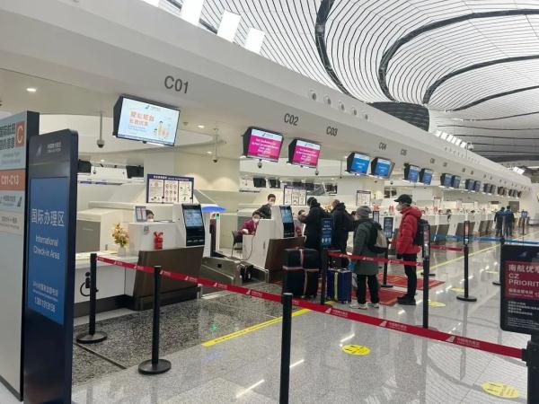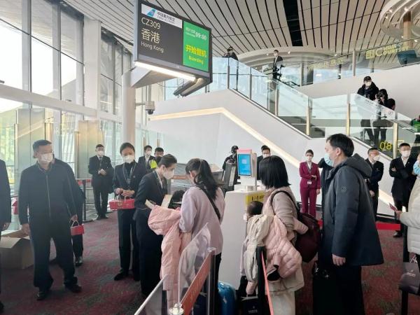 1月17日上午9點,從北京大興直飛中國香港的南航CZ309次航班起飛。這是大興機場恢復的首條國際及地區航班,標志著大興機場國際及地區航班正式復航。乘客關女士3年沒有出境旅游,這次準備和家人一起去香港過年。