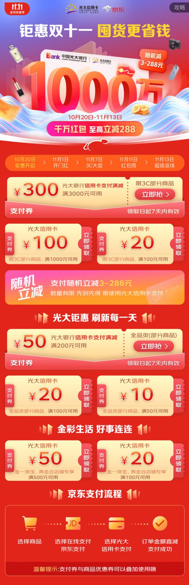 京東攜手光大銀行傾力打造“鉅惠雙十一,囤貨更省錢” 專場活動,覆蓋京東全品類生態場景,提供全品類隨機減、全品類支付滿減券等超多福利。活動期間,在京東商城使用京東支付時,光大銀行信用卡用戶可享受1次隨機立減優惠,單筆訂單滿3.01元最低減3元,最高可減288元。使用京東支付綁定光大銀行信用卡的實名用戶還可在指定活動頁面領取滿200減50元、100減20元、滿50減10元的支付券,用于購買全品類商品。