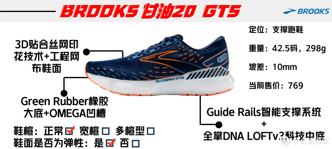 甘油20GTS在甘油20的基礎上增加了Guide Rails智能支撐系統,上延的泡棉搭配寬大的中底,組成了更加穩定的鞋床,有效減少了跑動時的雙腳外翻,運動也更加流暢自然。