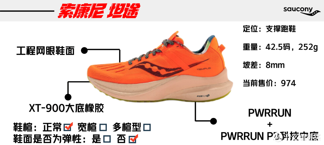 索康尼坦途徹底取消了TPU帶來的硬性支撐,采用雙密度中底設計,提升腳感舒適度的同時大大減輕了鞋身重量,非常適合大體重和初跑者訓練。