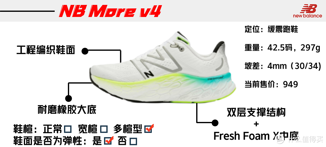 New Balance MORE v4是一雙腳感舒適且穩定感十足的緩震慢跑鞋,大量的泡棉堆積提升了中底的緩震極限,對于大體重跑者非常友好。