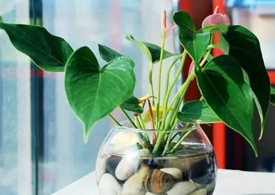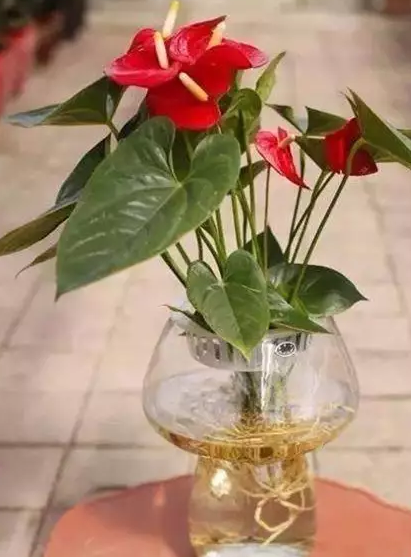 2、將紅掌放進水培瓶,里面的水剛剛沒過根系就可以。4天換水一次。長根后,7天換水一次。