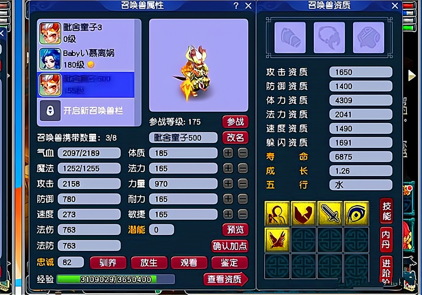 上面是一只5個技能的變異毗舍童子,這只變異毗舍童子現在已經打成了,這個樣子想要再進行改動的話真的沒有什么太好的改動方式。在給上面的這只召喚獸打書的時候很有可能會打掉一些比較值錢的技能,那樣就有點得不償失了,所以小編建議上面的這位玩家直接帶高級連擊的套裝,這樣在任務中使用的時候同樣會擁有比較好的使用效果,全力加點在抓鬼這種任務中打出去的傷害數據也是特別高的。