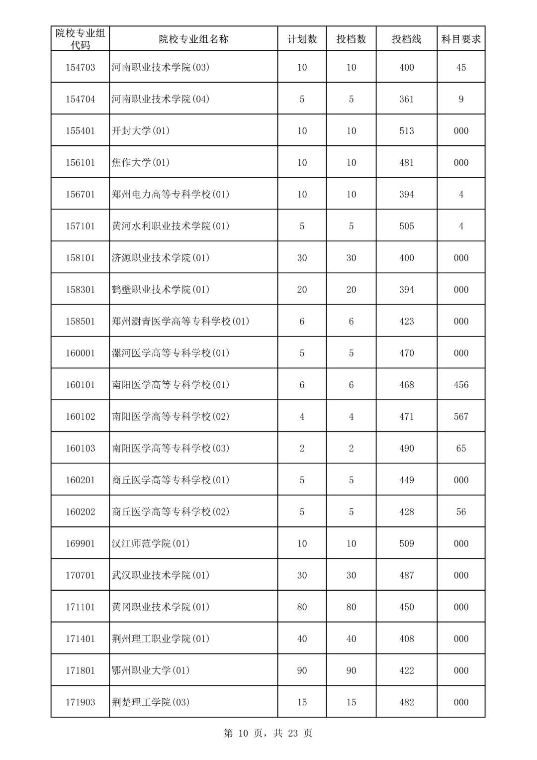 該批次投檔分數線顯示,部分高職(專科)院校專業組投檔分數線較高,超過500分的有:天津醫學高等專科學校(01)509分、東北石油大學(06)515分、東北石油大學(07)515分、東北石油大學(08)527分、東北石油大學(09)507分、泉州醫學高等專科學校(02)502分、贛州師范高等專科學校(01)503分、開封大學(01)513分、黃河水利職業技術學院(01)505分、漢江師范學院(01)509分、湖北中醫藥高等專科學校(02)531分、廣東輕工職業技術學院(02)520分、海南醫學院(17)521分、海南醫學院(19)527分、瓊臺師范學院(11)503分、重慶城市管理職業學院(02)506分、重慶三峽醫藥高等專科學校(04)503分、重慶醫藥高等專科學校(01)502分等。