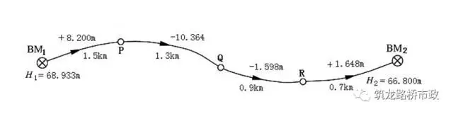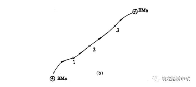 如圖(b),從一個已知高程的水準點BMA出發,沿一條路線進行水準測量,依次測定若干個待定高程的水準點1、2、3、…,最后附合到另一個已知高程的水準點BMB上,稱為附合水準路線。