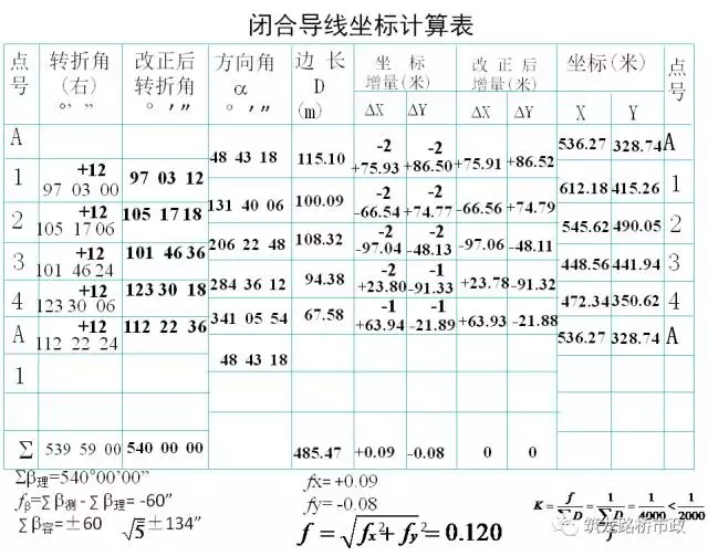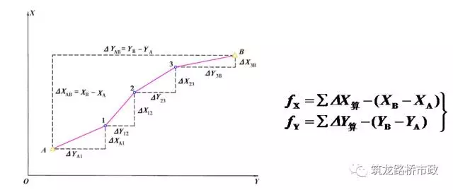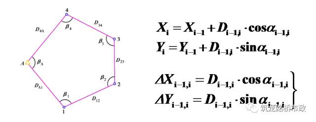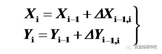 用改正后的坐標增量,就可以從導線起點的已知坐標依次推算其它導線點的坐標,即:
