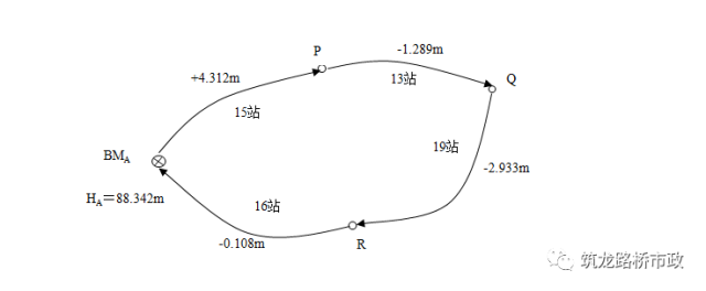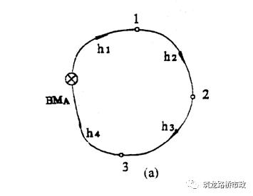 如圖(a),從一個已知高程的水準點BMA出發,沿一條環形路線進行水準測量,依次測定若干個待定高程的水準點1、2、3、…,最后又回到水準點BMA,稱為閉合水準路線。