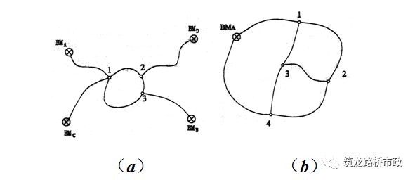 (1)附合水準網 如(a),從多個已知高程的水準點出發,由若干條單一水準路線相互連接而構成的網狀圖形。
