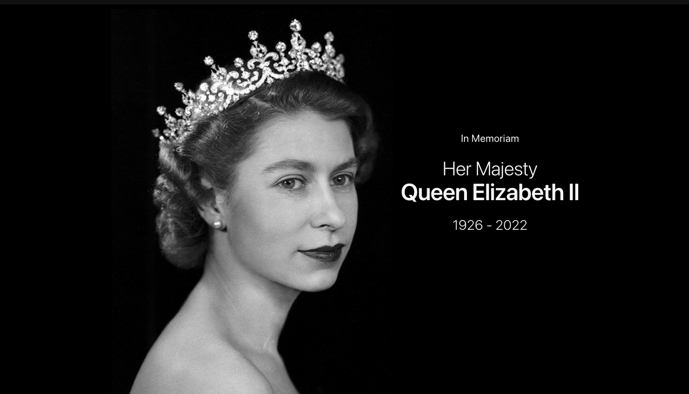9月9日,英國首相伊麗莎白·特拉斯宣布了英女王伊麗莎白二世離世的消息,哀悼活動于溫莎城堡、白金漢宮舉行。與此同時,蘋果公司也將官網主頁更換為伊麗莎白二世的巨幅海報,以此紀念這位英國在位時間最長的君主。