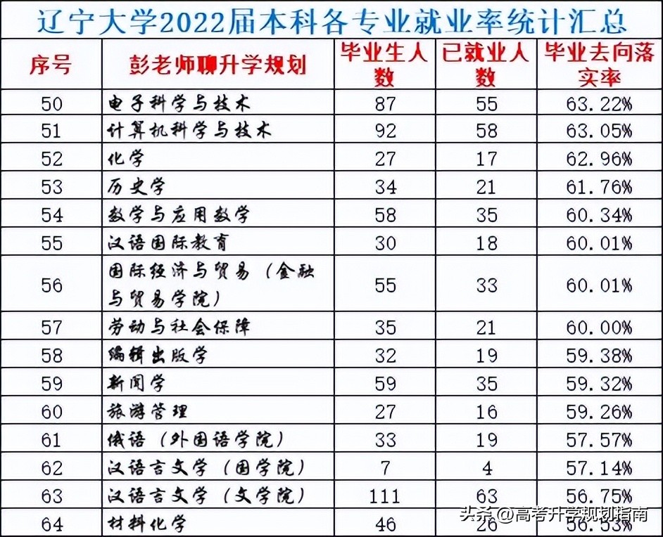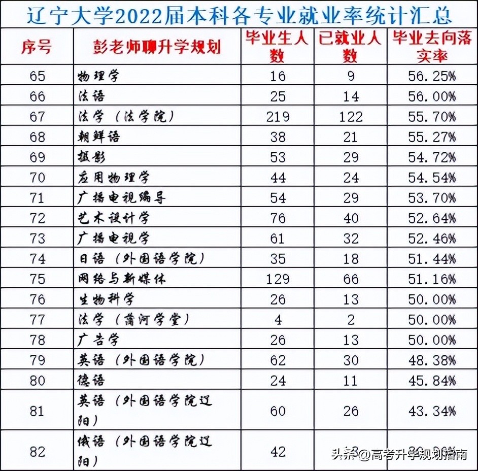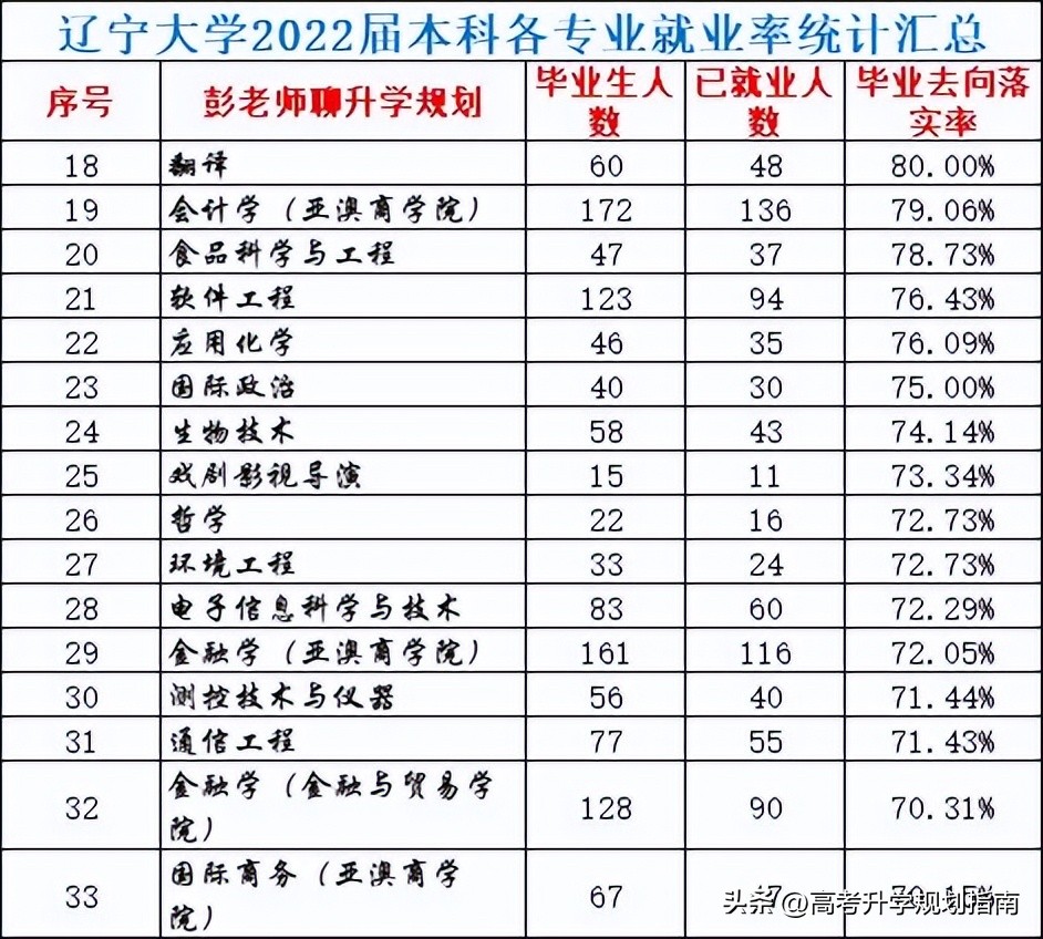 遼寧大學2022屆本科各專業就業統計分析:33個專業就業率高于70%,49個專業保研率低于70%,其中4個專業就業率低于50%。