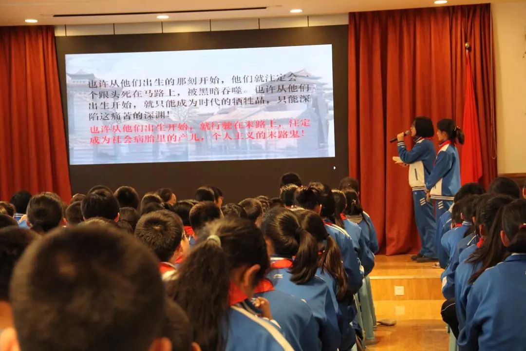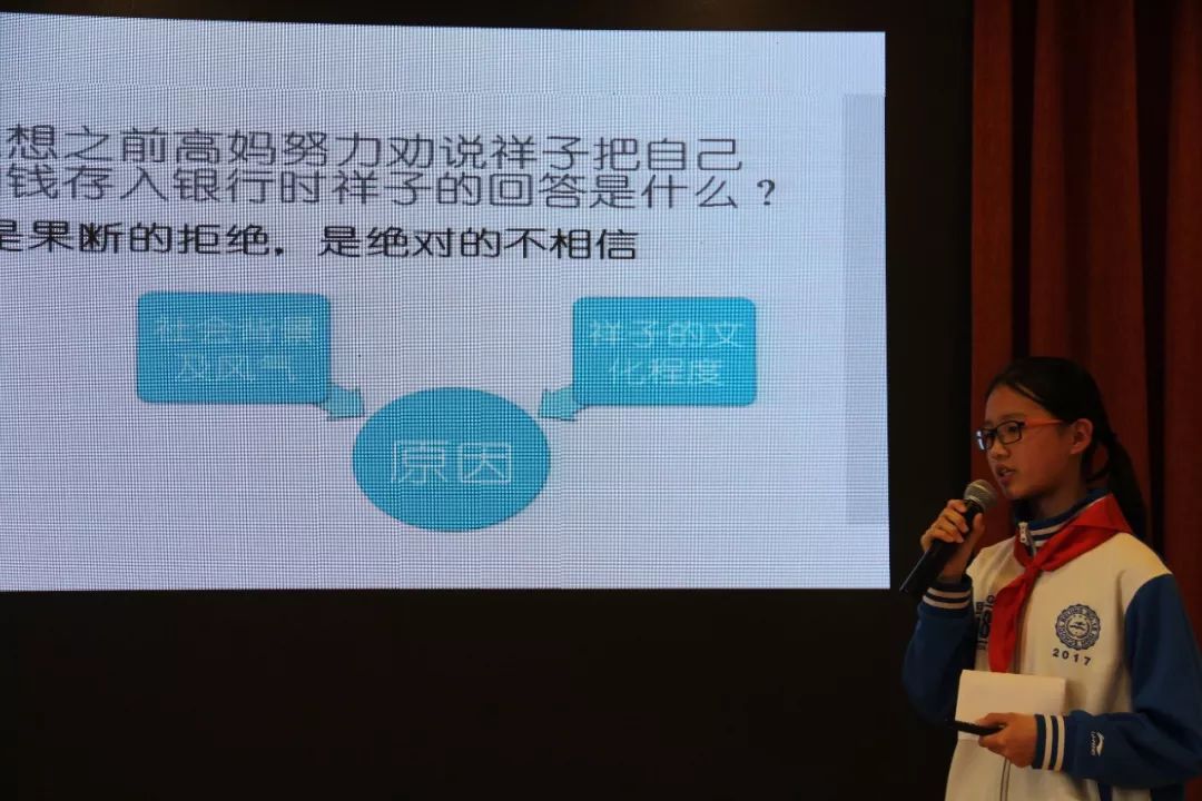 初一(4)班王婧宣和張東方以“人生坎坷,不忘初心,追逐夢想”為匯報主題,通過祥子命運三部曲,展現出了一個黑暗的社會,造就形形色色虛偽的人,它是一切的幕后黑手,是鑄成這些人悲慘結局的主謀。