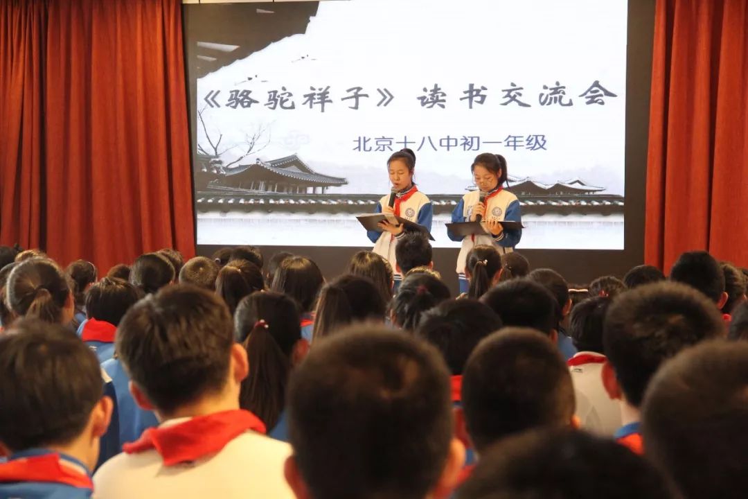 2018年4月12日下午,北京市第十八中學初一年級迎來了一場別開生面的讀書交流會。這次讀書交流會的主題是“《駱駝祥子》——舊北京人力車夫的一生”,各班同學紛紛上陣妙語解頤,針對自選的研究主題侃侃而談,表現落落大方。