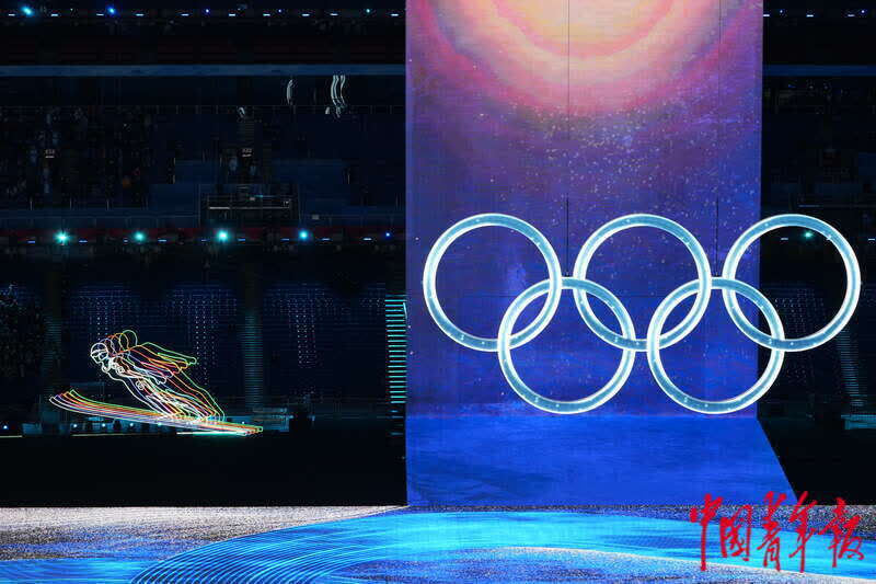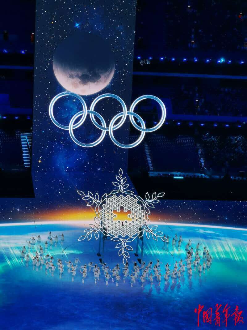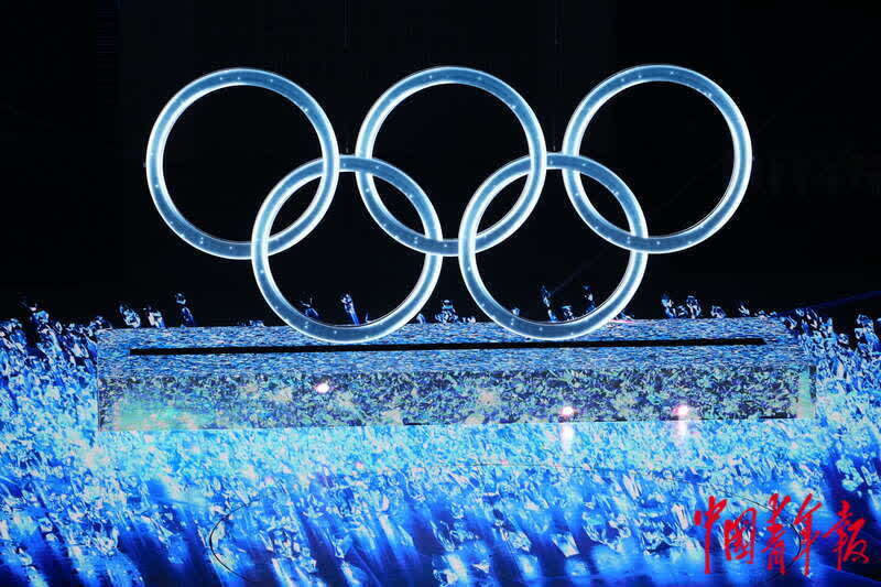 2月4日晚,第二十四屆冬季奧林匹克運動會開幕式在北京國家體育場舉行。重達3噸的冰五環亮相舞臺。中青報·中青網記者 李雋輝/攝