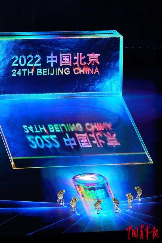 2月4日晚,第二十四屆冬季奧林匹克運動會開幕式在北京國家體育場舉行。舞臺上的“冰立方”打出“中國北京”的字樣。中青報·中青網記者 李雋輝/攝
