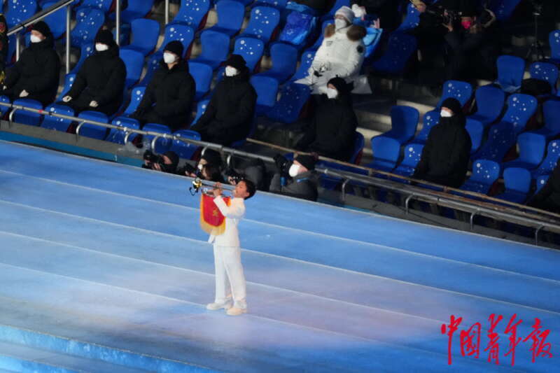 2月4日晚,第二十四屆冬季奧林匹克運動會開幕式在北京國家體育場舉行。傳遞國旗環節,一名小朋友用小號吹奏《我和我的祖國》。中青報·中青網記者 李雋輝/攝