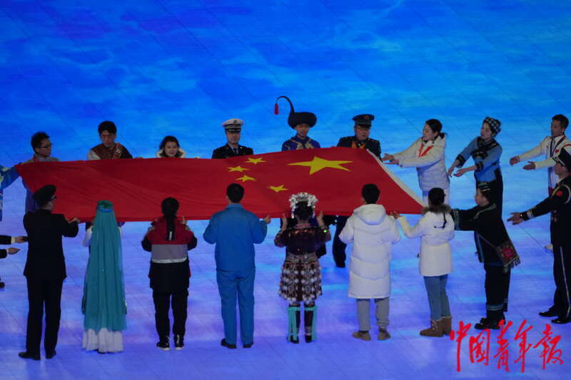 2月4日晚,第二十四屆冬季奧林匹克運動會開幕式在北京國家體育場舉行。由普通人組成的群眾隊伍正在傳遞中華人民共和國國旗。中青報·中青網記者 李雋輝/攝