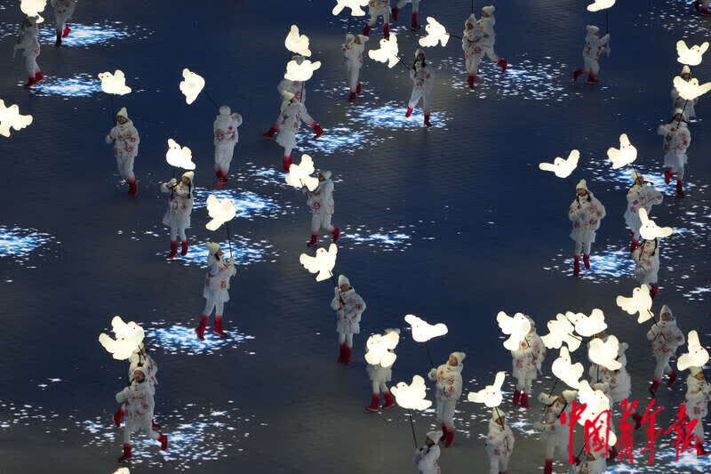 2月4日晚,第二十四屆冬季奧林匹克運動會開幕式在北京國家體育場舉行。舉著“和平鴿”的小朋友們在舞臺上奔跑。中青報·中青網記者 李雋輝/攝