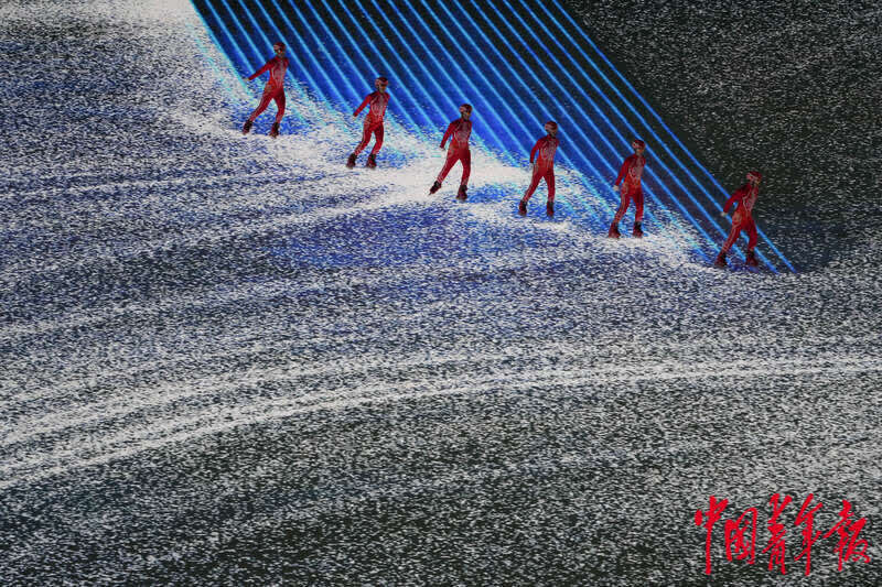 2月4日晚,第二十四屆冬季奧林匹克運動會開幕式在北京國家體育場舉行。在《想象》的歌聲下,24名北京體育大學的學生在舞臺上“滑”出中國結的圖案。中青報·中青網記者 李雋輝/攝