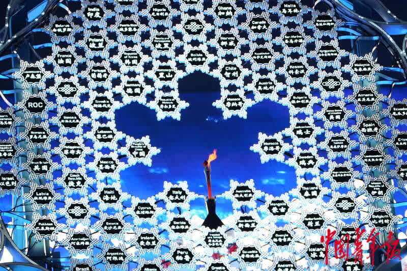 2月4日晚,第二十四屆冬季奧林匹克運動會開幕式在北京國家體育場舉行。奧運點火儀式上,主火炬搭乘一朵雪花升起在舞臺中央。中青報·中青網記者 李雋輝/攝